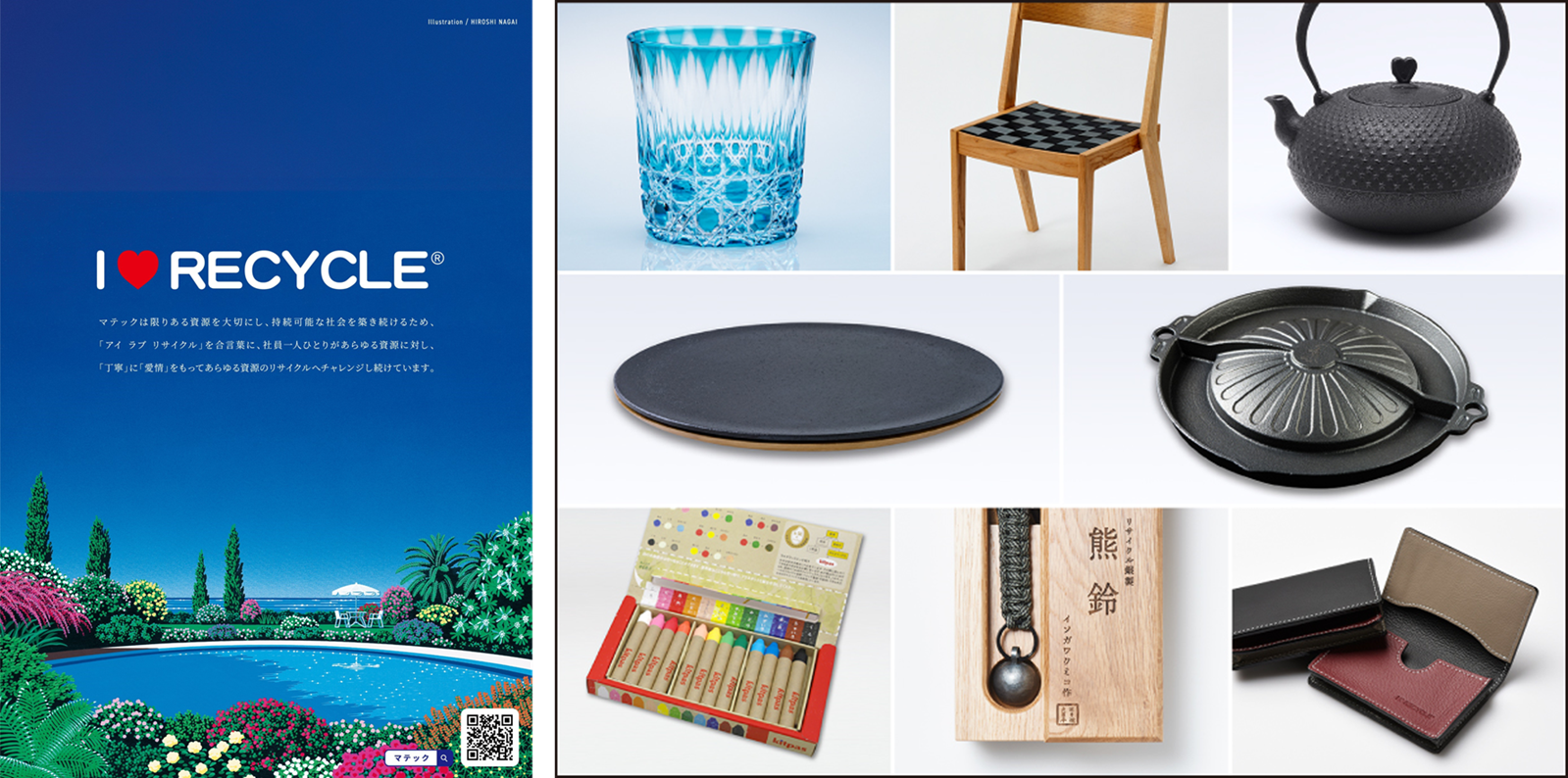 マテックは、「I♥RECYCLE」を合言葉に社員一人ひとりがあらゆる資源に対して、「丁寧」に「愛情」をもって資源のリサイクルへチャレンジすることを大切にしています。ELVのリサイクルにおいても、常にまだ満足のいくリサイクルが実現できていない資源はないか?という観点で検討を行っており、直近ではタイヤの新たなリサイクルに向けた取り組みを開始しました。また、リサイクルの可能性や未来環境への重要性を伝えることを目的に、使用しなくなった素材にアート作品として独創的な息吹を吹き込む「リサイクルアート展」に特別協賛しているほか、志を同じくする企業様、職人様とともに、より価値を高めたものに活かしていくアップサイクル製品を生み出す活動を推進しています。