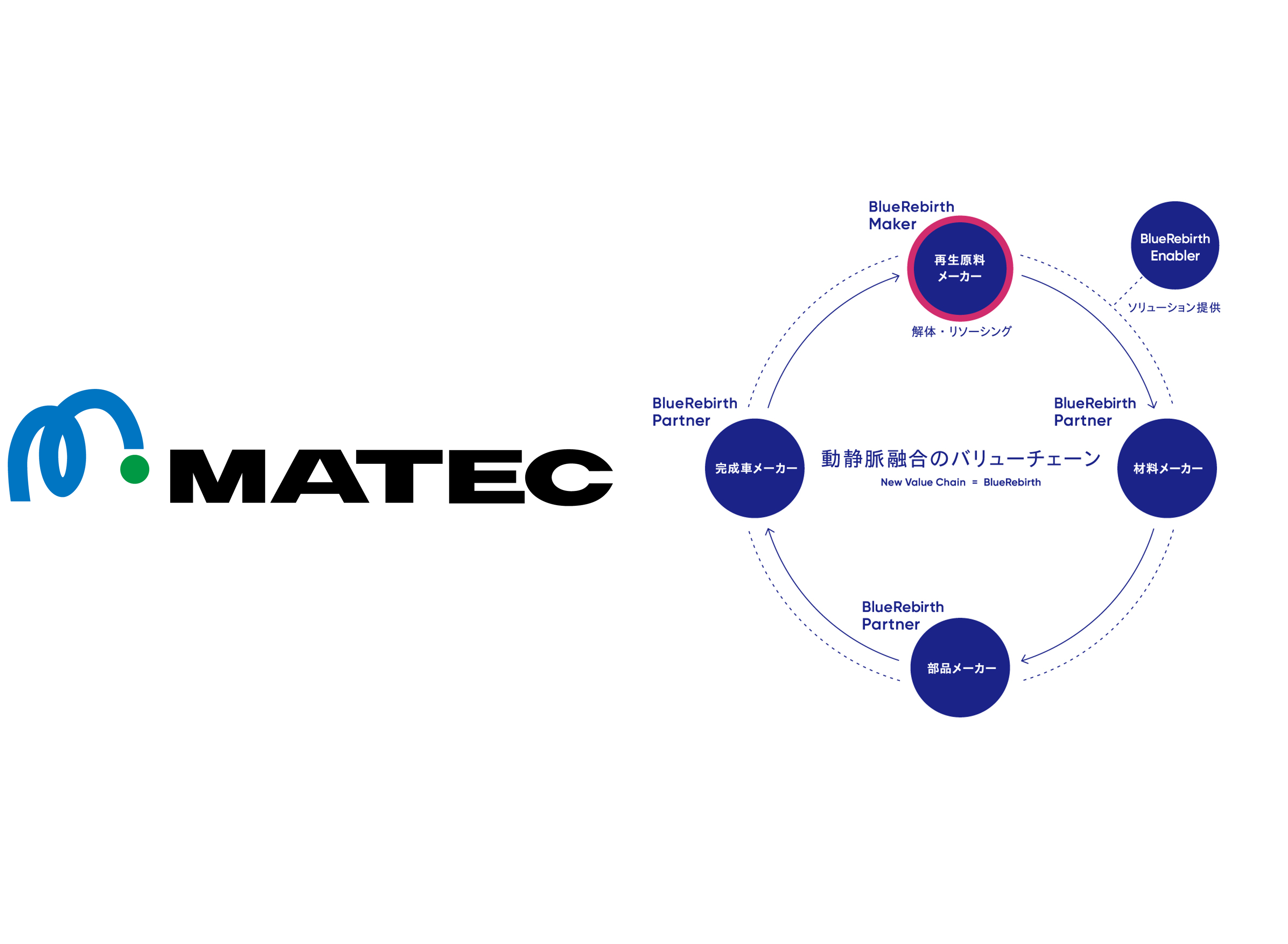 「マテリアルクリエーション(資源の創造)」を社名の由来とする当社は、ELV(使用済自動車)のリサイクル分野において、引き取りから解体、破砕、ASR(自動車シュレッダーダスト)再資源化や回収したさまざまな部品の資源化までを一気通貫で取り組んでいます。特に、破砕する前の解体工程における高品質な再生資源の回収は以前から徹底しており、ロボットによる自動精緻解体を起点とした再生資源獲得をめざすBlueRebirthにおいては、当社が獲得してきたノウハウを活かして高品質な再生資源をメーカーの皆さまにお届けする「再生原料製造メーカー=BlueRebirth Maker」としての使命を存分に発揮できると自負しています。自動車産業における動静脈を融合したバリューチェーンの社会実装に向けては、まだまだ課題が山積していますが、さまざまな立場のプレイヤーが引き続き議論を重ねていくことで、その構想は必ずや実現する。そんな強い思いをもって自らの役割を果たしていきたいと思います。