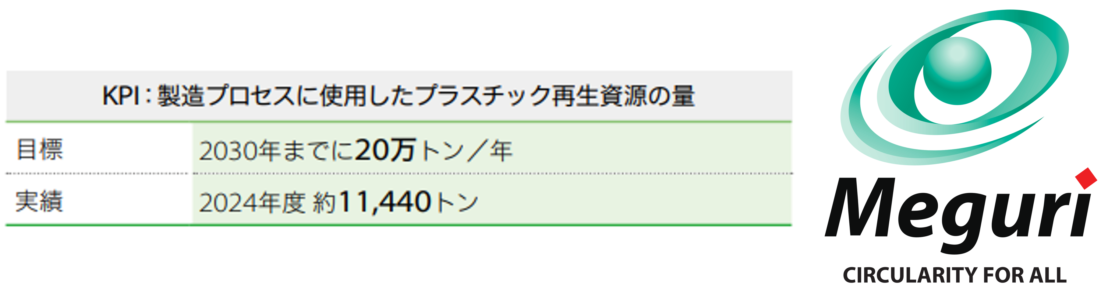 住友化学は、リサイクル技術を活用して製造するプラスチック製品の統合ブランド「Meguri®」を通じて「資源循環」「CO₂削減」「優れた品質」「トレーサビリティ」の4つの価値を追求しています。また、「製造プロセスに使用したプラスチック再生資源の量」を経営の重要なKPIと位置づけ、2030年までに当社の製造プロセスに使用するプラスチックのうち20万トン/年を再生資源に置き換えることをめざしています。